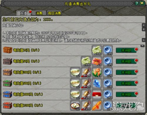 1月15日9:00,1月充消活动开启!参与充值消费活动即可享受充值奖励、消费奖励、每日消费奖励。充值多多,奖励多多,快来参与吧