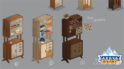 即使30天的雪崩倒计时迫在眉睫,作为经营者的我们仍拒绝向绝望妥协。在《覆雪之上》中,珍惜生命的方式就是将生活升华为艺术。游戏深度联动了Fjord Fiesta、Heywood-Wakefield等经典家具品牌,在严谨还原1960年代设计美学的基础上,为每一件家具打造了极具细节的定制化外观,不仅包括木头的颜色纹样,还涉及到家具内部物品的种类与放置方式。以橱柜为例,游戏设计了放置着陶瓷厨具的碗柜,摆放着书籍和台灯的书架,还有摆放着绿色植物的杂物柜。这种细节上的美学考究,是开发团队不仅认真思考了家具们的使用场景,还努力为游戏中的角色生活注入了热爱生活的艺术。