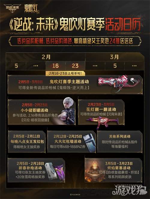2月5日-3月8日,参与鬼吹灯赛季主题活动,即可免费获得全新传说品阶枪械【鬼铜蚀-逆火而上】。