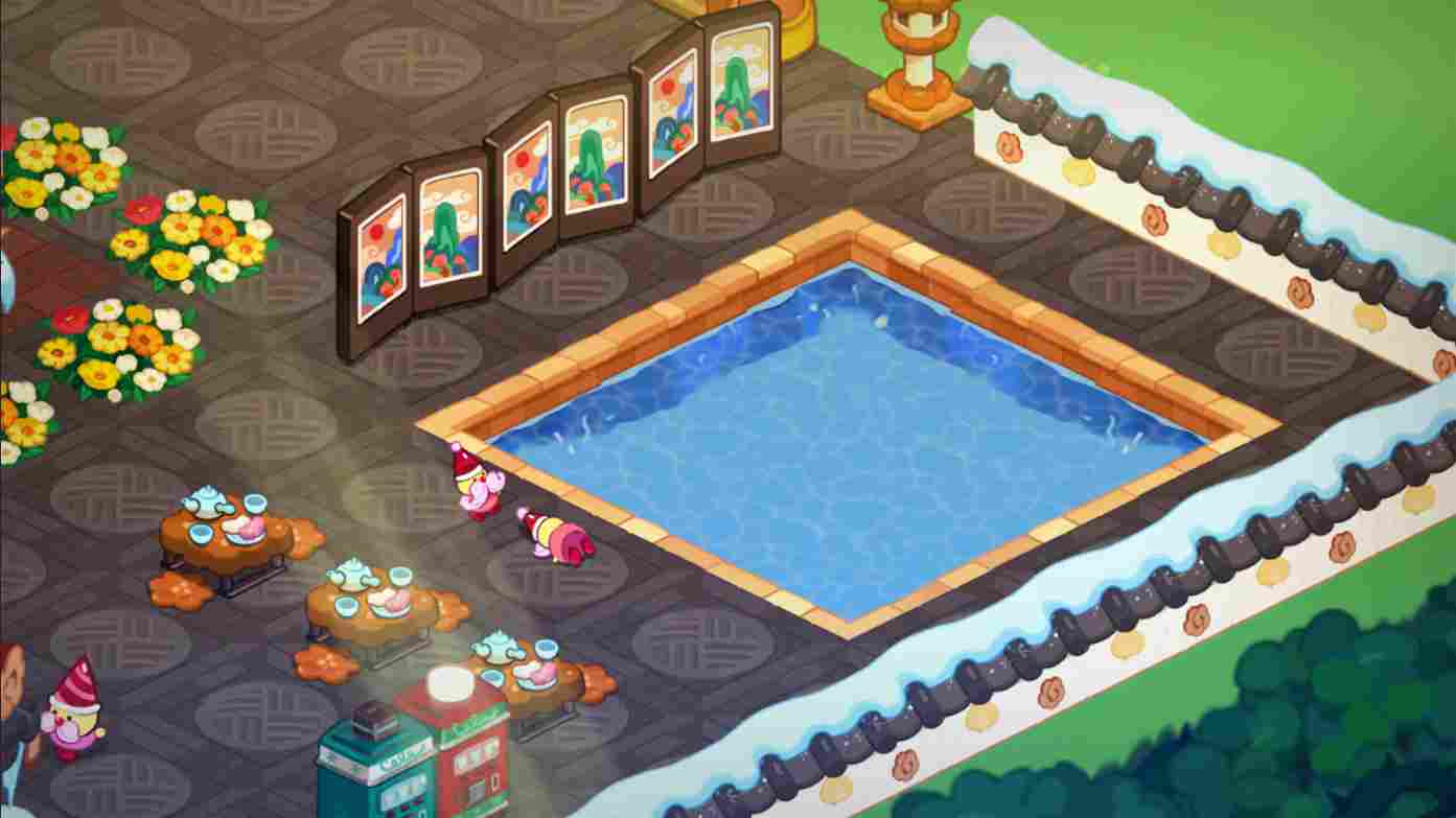 木偶剧场采用了英雄故事木偶剧建筑、冰雪蓝焰路灯建筑、杏仁果面包长椅建筑。可以供饼干们看木偶剧放松娱乐。汤池就是我的灵光一现了,在寒冷的冬天泡汤池真的太舒服了,给饼干们也体验一下。我还特意用屏风挡住了,给足了饼干们隐私。旁边还有给他们准备的下午茶热饮,他们泡完了就可以吃吃喝喝聊聊天。有趣的是,我在旁边放了一个跌倒的糖糖地精和一个站立的糖糖地精,想的是一个糖糖地精从汤池出来跌倒了,另一个糖糖地精发现了,猜猜他会不会扶起他呢。