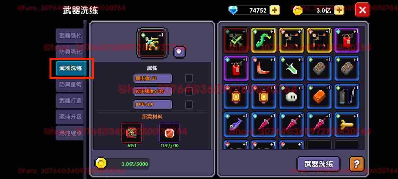 打开铁匠铺,找到武器洗练,我们就重点洗练上面提到的首领伤害、暴击值、护甲穿透三个属性,如果洗不到也没关系,稍微洗一洗能用即可,毕竟只是一把过渡武器。多余的碎片也可以用于魂珠升星,至于什么是魂珠我们下面再说。