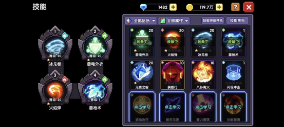 通关小秘境第6关后,系统会引导你抽取一次技能,我们获得【雷枪术】。不过本次我们不怎么用它,技能选择如下图,第四个位置可以放雷枪术,也可以选更具价值的元素之智。