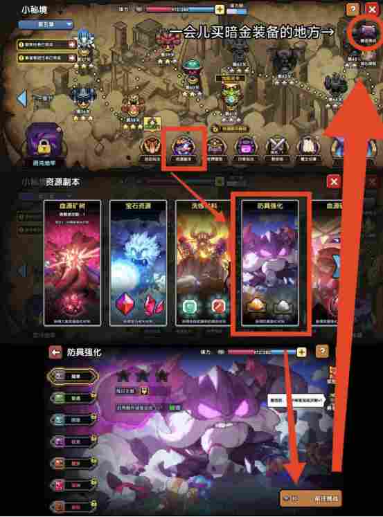 然后,跟随系统引导,通关前3关(可以稍微在3-4关之后把地图顶部,体力条右侧的体力锁打开,将体力用于靠后的副本,收益会高一点,然后差不多30-40层再打开,刷点宝石和装备来替换)。
