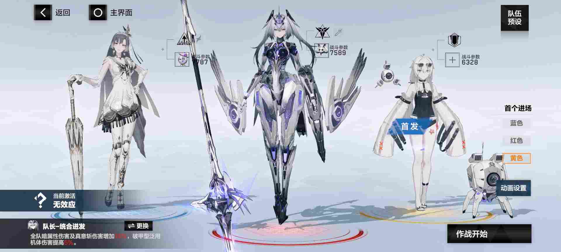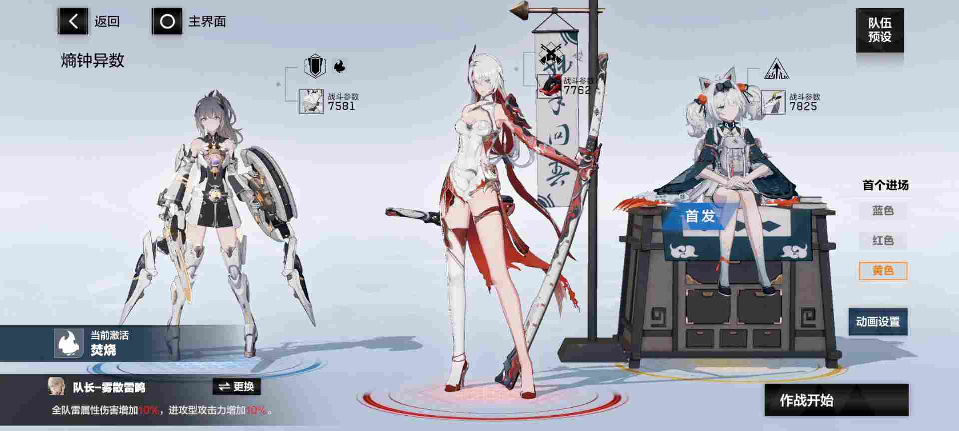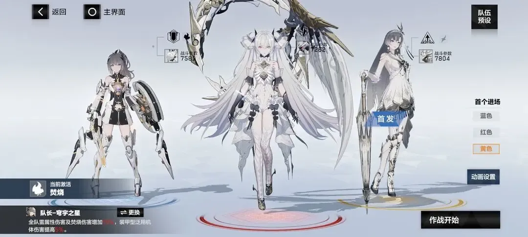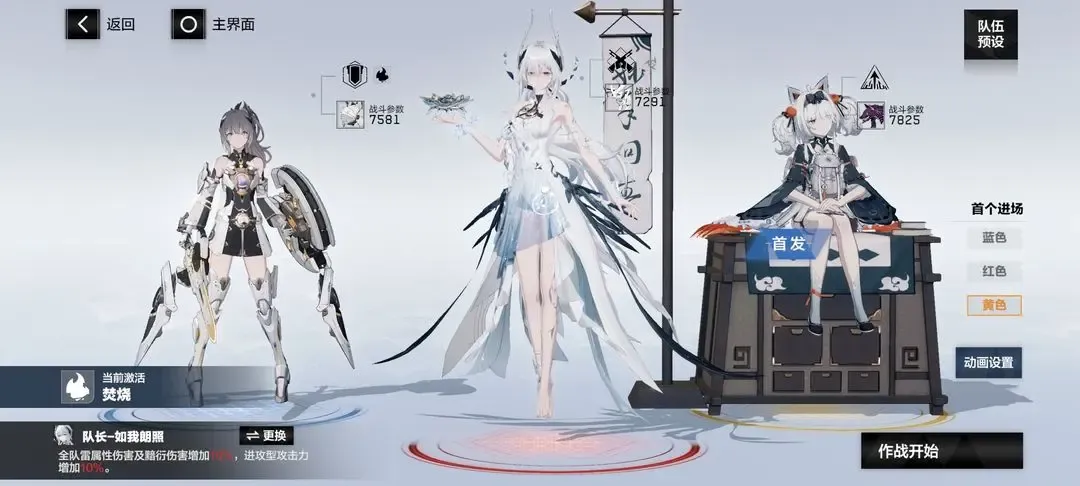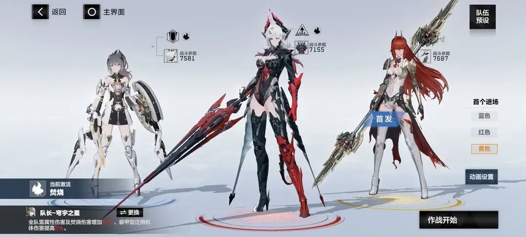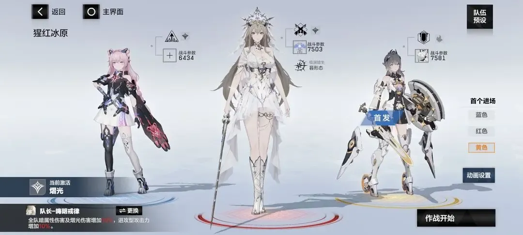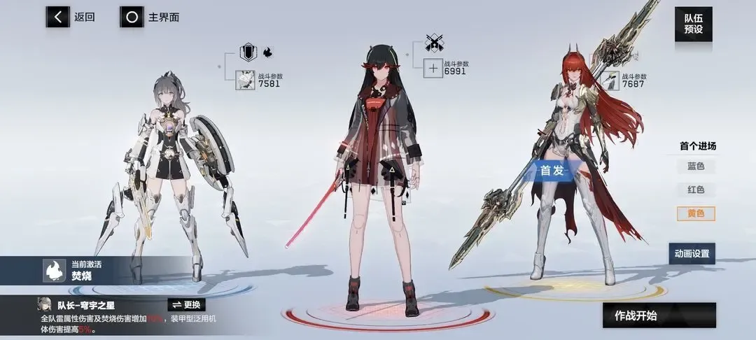 ⑥熠光:布偶熊·骇影(蓝位,首发),比安卡·晖暮(红位,队长),七实·芒星之迹(黄位)