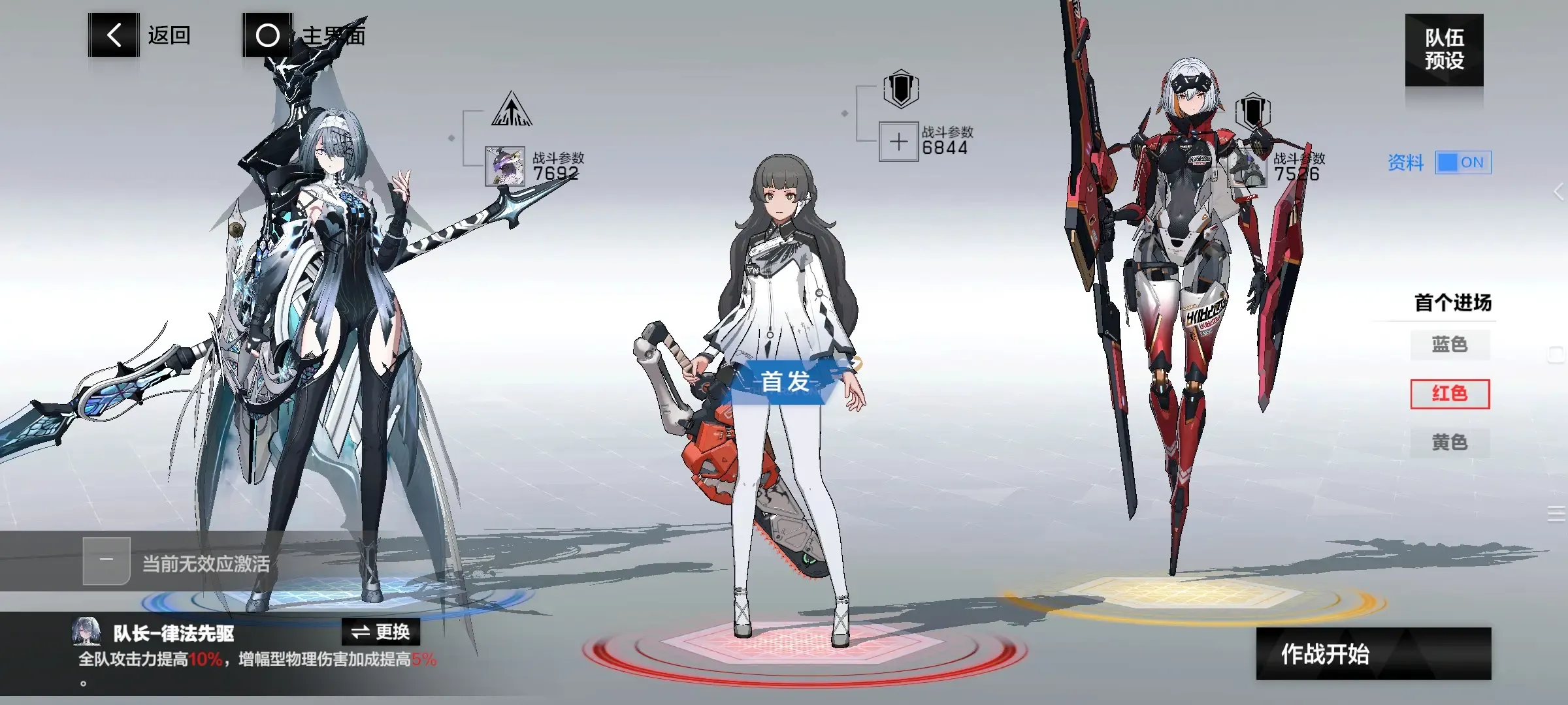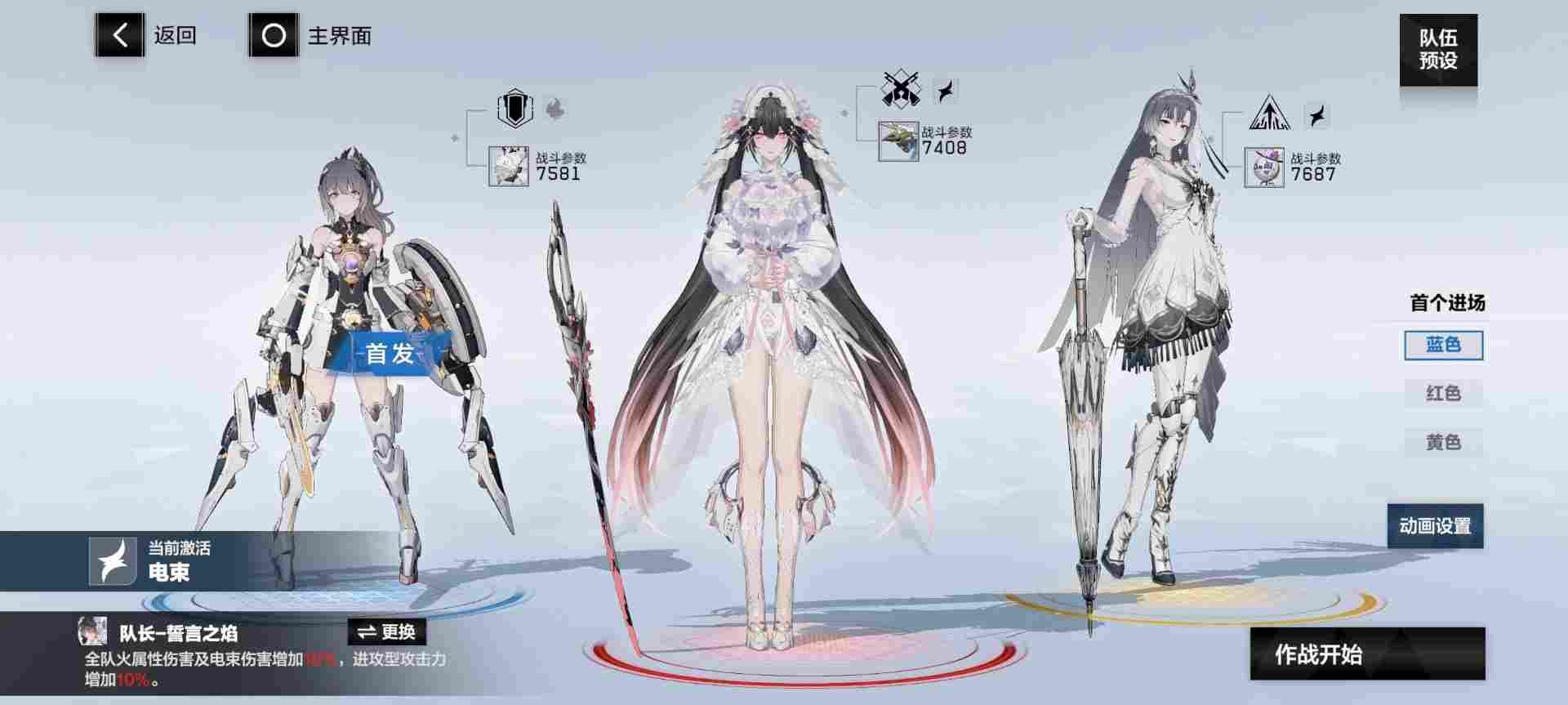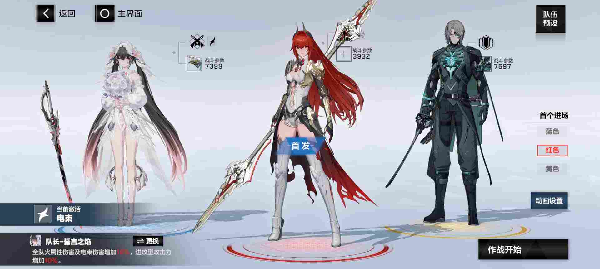 ②电束:七实·芒星之迹(蓝位,首发),露西亚·誓焰(红位,队长,输出),莉莉丝·谬影(黄位,启动),