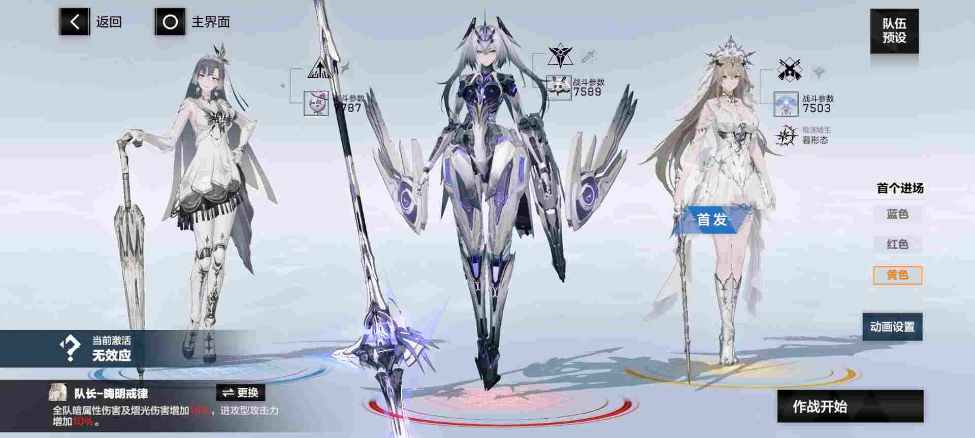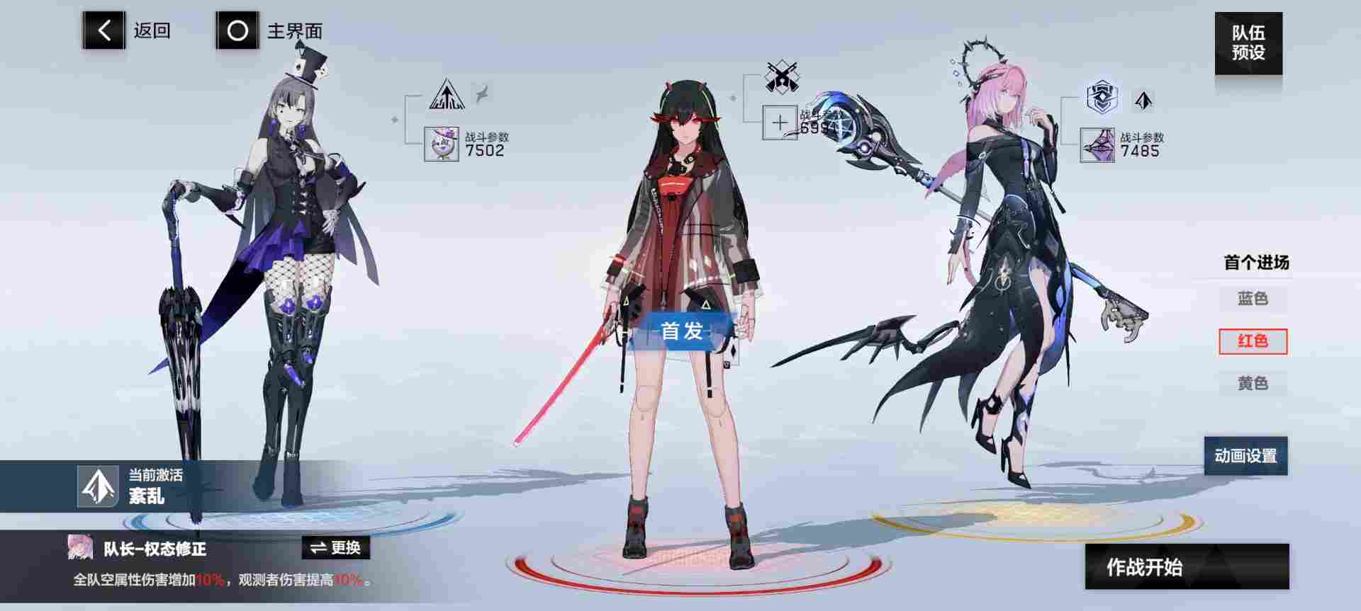 ⑤黯衍:渡边·尘铭(蓝位),薇拉·灼惘(红位,启动),丽芙·霁梦(黄位,队长,首发,输出)