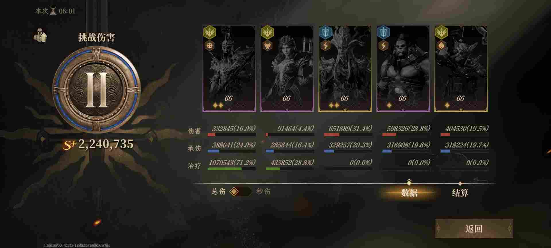 在这个基础上就可以进行新的一轮测试了。因为我几乎没有狂野角色,所以直接冲着无畏去用组了。一开始是古木+双刀+夏特(因为只有这三无畏),测试发现夏特输出并不高,暴毙还特别快,所以在此基础上就在对夏特进行优化。