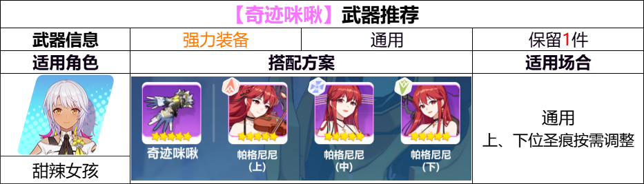 [奇迹咪啾]为'甜辣女孩'的毕业武器,被动技能在释放必杀技后会增加全队物理伤害,主动技能可以造成高段数攻击及增加自身蓄力伤害。但是乐土中因为武器主要加成效果只有必杀技释放后的物理加成对伤害有较大影响,其余蓄力相关效果基本不会用到,所以会更倾向使用[千翎湮尘]。