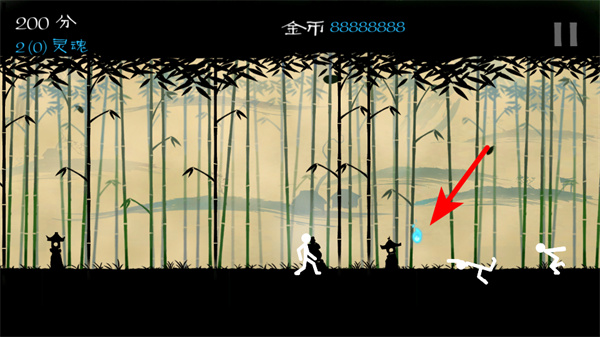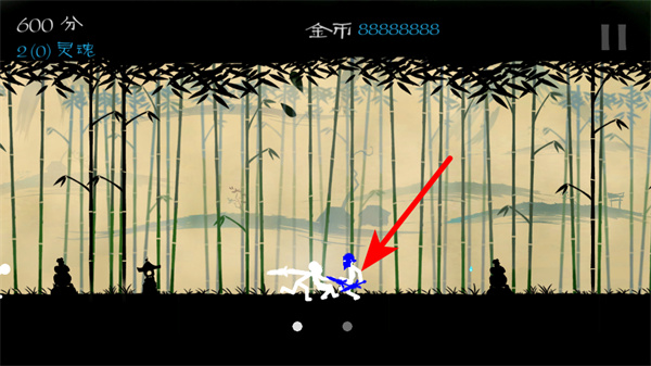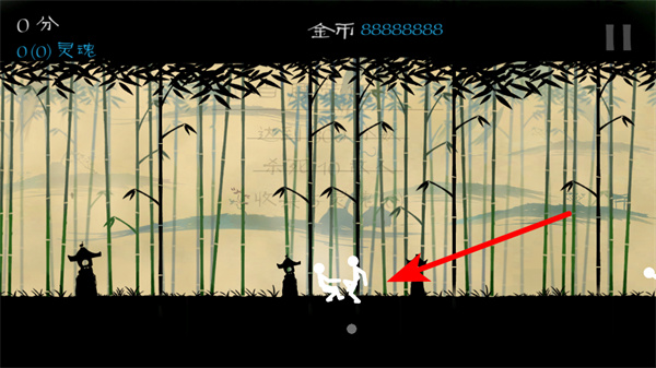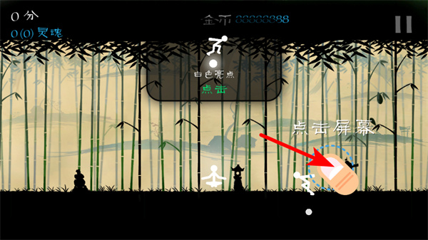 1、根据指引点击屏幕,操控白色火柴人角色,开启竹林场景的格斗冒险。