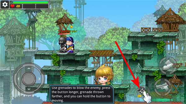 4、长按手雷按钮,根据长按时长调整投掷距离,向敌人投掷手雷,利用爆炸消灭敌人。