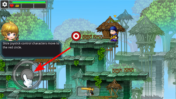 1、滑动左侧摇杆,操控角色移动到红色圆圈标记的位置,完成移动操作教学。
