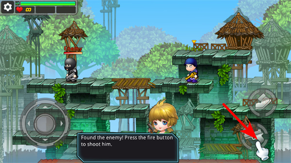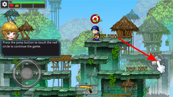 2、点击右侧跳跃按钮,让角色跳跃并触碰红色圆圈,掌握跳跃操作,继续推进游戏。