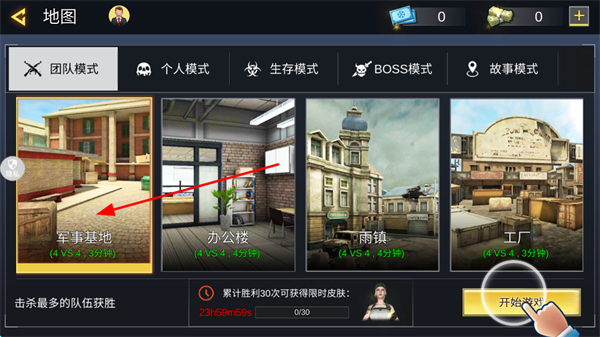 1、模式选择界面挑选团队模式,选定军事基地等地图,点击开始游戏进入对局。