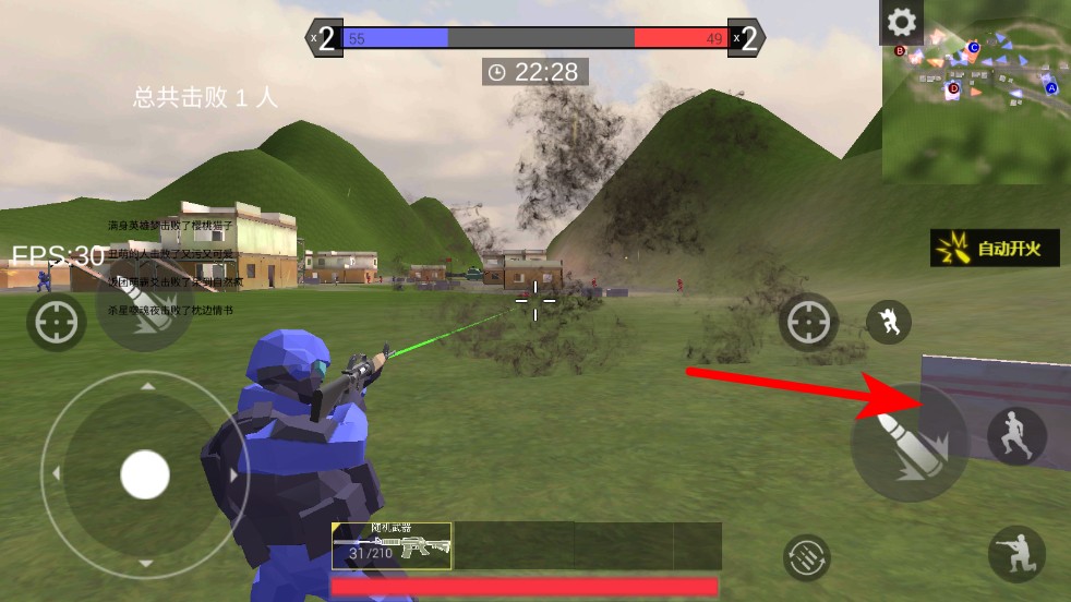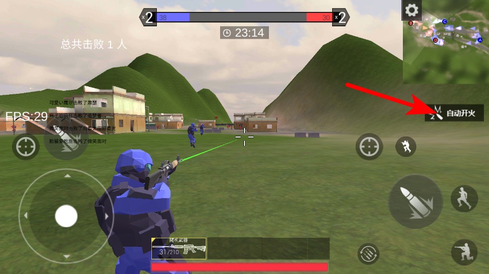 3、点击右侧开火按钮,操控枪械持续射击远处的敌人,提升总击败数,扩大战场优势。
