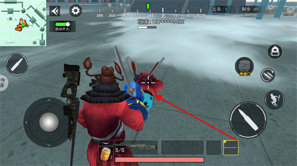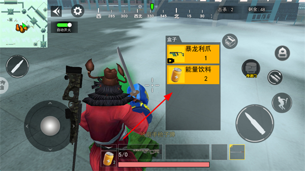 2、遭遇敌方玩家时,点击开火按键射击,击败敌人后,靠近盒子拾取暴龙利爪等装备与道具。