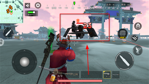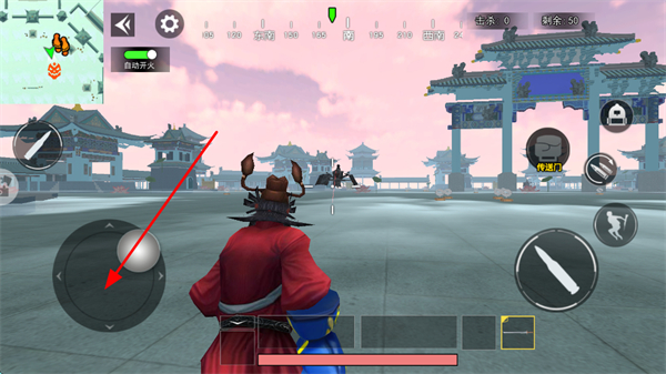 1、开始游戏后,左侧摇杆操控角色移动,在中式古建战场中探索,开启自动按键准备战斗。