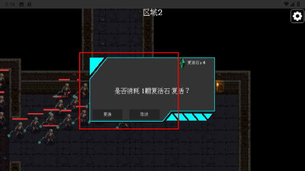 4、角色生命值耗尽时,可选择消耗复活石复活继续战斗,或放弃挑战,重新开启地牢探索。