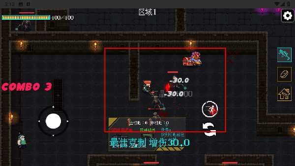 1、操控角色在地牢区域1中移动,使用武器攻击各类怪物,打出连击造成伤害,推进关卡探索。