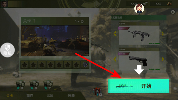 1、点击右下角绿色开始按钮,进入关卡1,开启FPS射击对战。