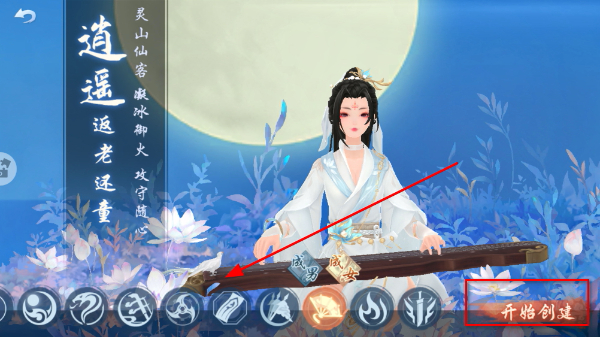 1、在职业选择界面,选定逍遥职业,点击开始创建按钮,生成专属游戏角色。