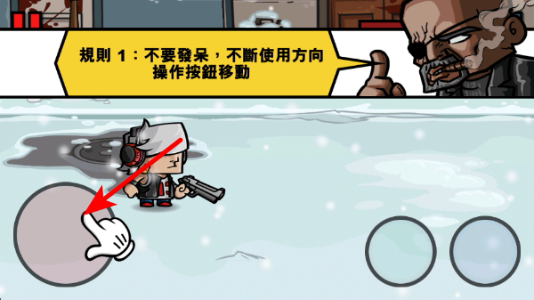 2、根据指引点击左下角方向摇杆,操控角色移动,熟悉基础走位操作。