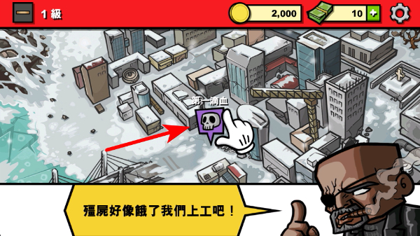 1、点击地图上的骷髅头图标,进入第一滴血关卡,开启僵尸战斗。