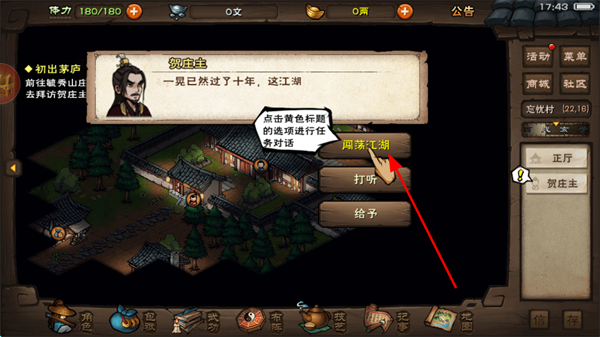 3、与贺庄主对话时,点击闯荡江湖等选项,推进剧情,解锁更多玩法与任务。