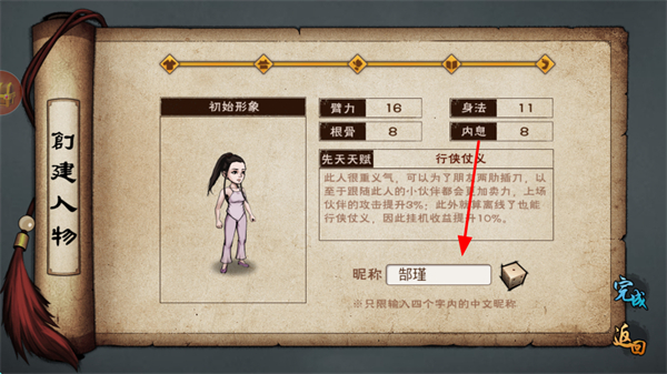 1、新手在创建,输入昵称,查看初始属性与天赋,点击完成,创建角色,开启江湖冒险。