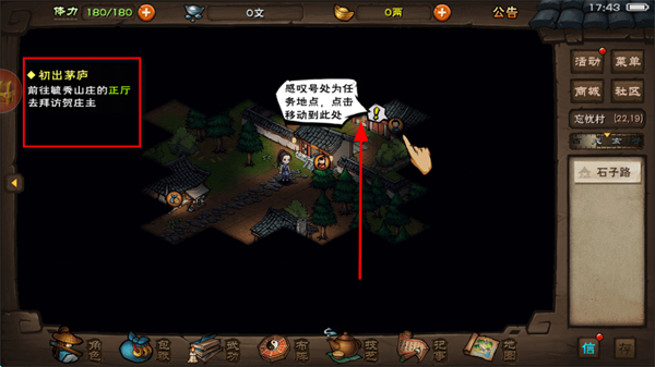 2、进入游戏后,接取初出茅庐等主线任务,跟随指引前往毓秀山庄正厅,拜访贺庄主。