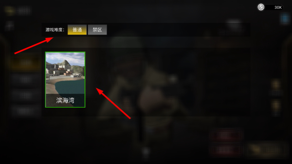 4、进入地图选择界面,选择游戏难度为普通或禁区,选择滨海湾地图,确认后进入对应地图,开启射击对战任务。
