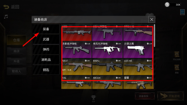 3、在装备商店查看武器装备弹药消耗品钥匙等分类,选择汤普森冲锋枪维克托冲锋枪等武器,购买后装备角色。