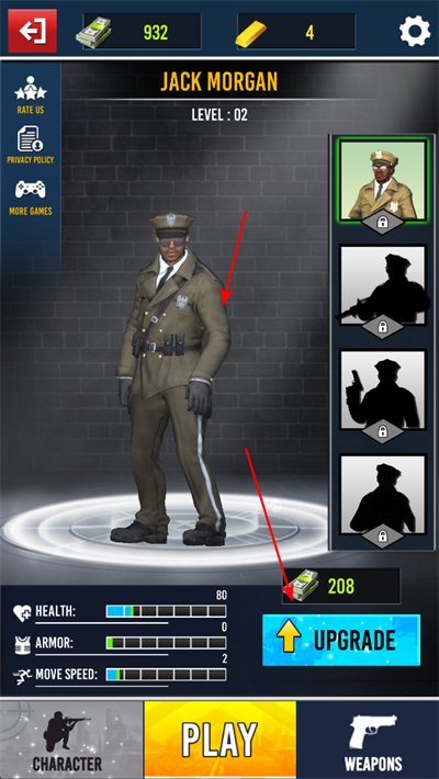 4、进入角色界面,查看JACK MORGAN的生命值护甲等属性,点击UPGRADE按钮,消耗金币升级角色,提升生存能力。