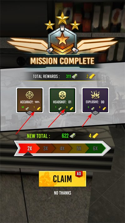 3、完成任务后进入结算界面,查看总奖励与各项评分,领取对应金币金条,可选择倍数加成,获取更多资源。