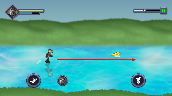 3、进入水域场景后,可通过左右移动按钮操控僵尸前行,同时注意躲避水面的障碍物。
