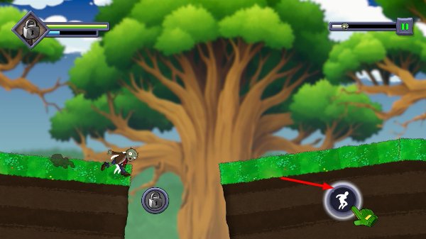 2、遇到沟壑地形时,点击右侧跳跃按钮,操控僵尸跳过障碍,避免掉落,继续保持前进节奏。