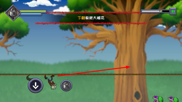 4、遇到大嘴花等危险植物时,点击下翻按钮,操控僵尸倒挂躲避,成功避开后继续向前闯关。