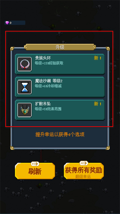 2、角色升级时,从贵族头环等强化选项中选择,提升经验获取和技能范围。