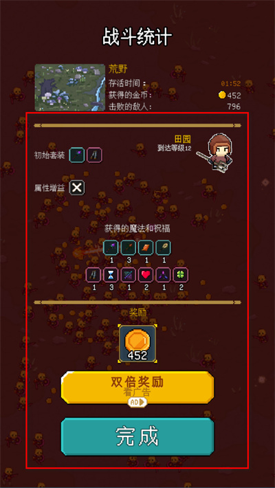 4、关卡结束后,查看战斗统计,领取金币奖励,可选择双倍奖励后点击完成。