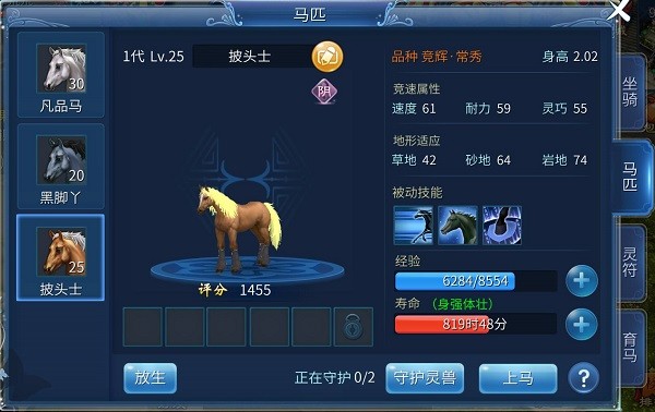 点击马匹页签,可以查看马匹的性别、等级、经验、寿命、竞速属性、地形适应、被动技能等各项资料。