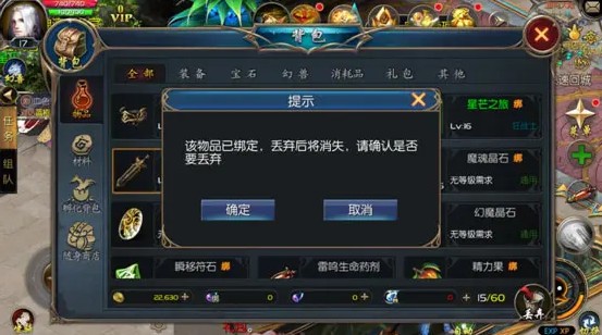 通过【背包】开启物品栏,选定想要丢弃的物品后,点击【丢弃】按键,再点击确定后便可丢弃。