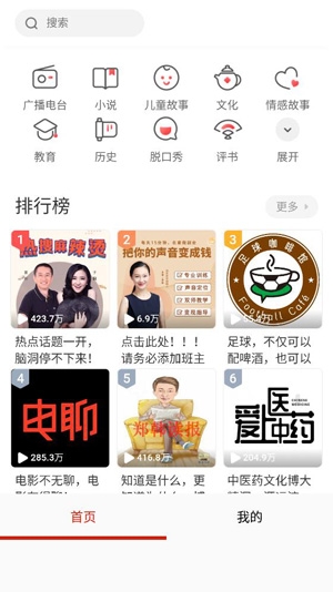 3、特色频道预设,预设小说频道、综合频道、文艺频道、我的频道,涵盖童话、相声、养生、文史、小说、职场、故事等多个类别