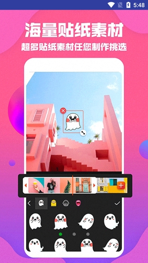 2、不仅能在该剪辑页面中剪切段落,还能给视频添加上精美的滤镜特效,或在某段中添加上特殊的趣味贴纸。