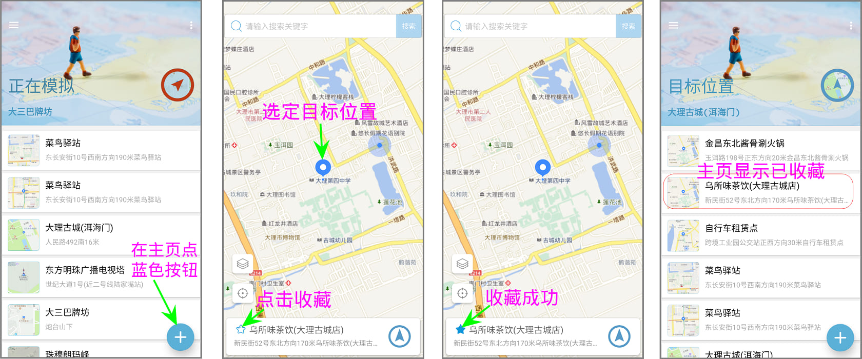 如果每次都需要在地图上搜索、选择、模拟,操作步骤特别麻烦,可以将地点收藏起来,下次快捷使用。