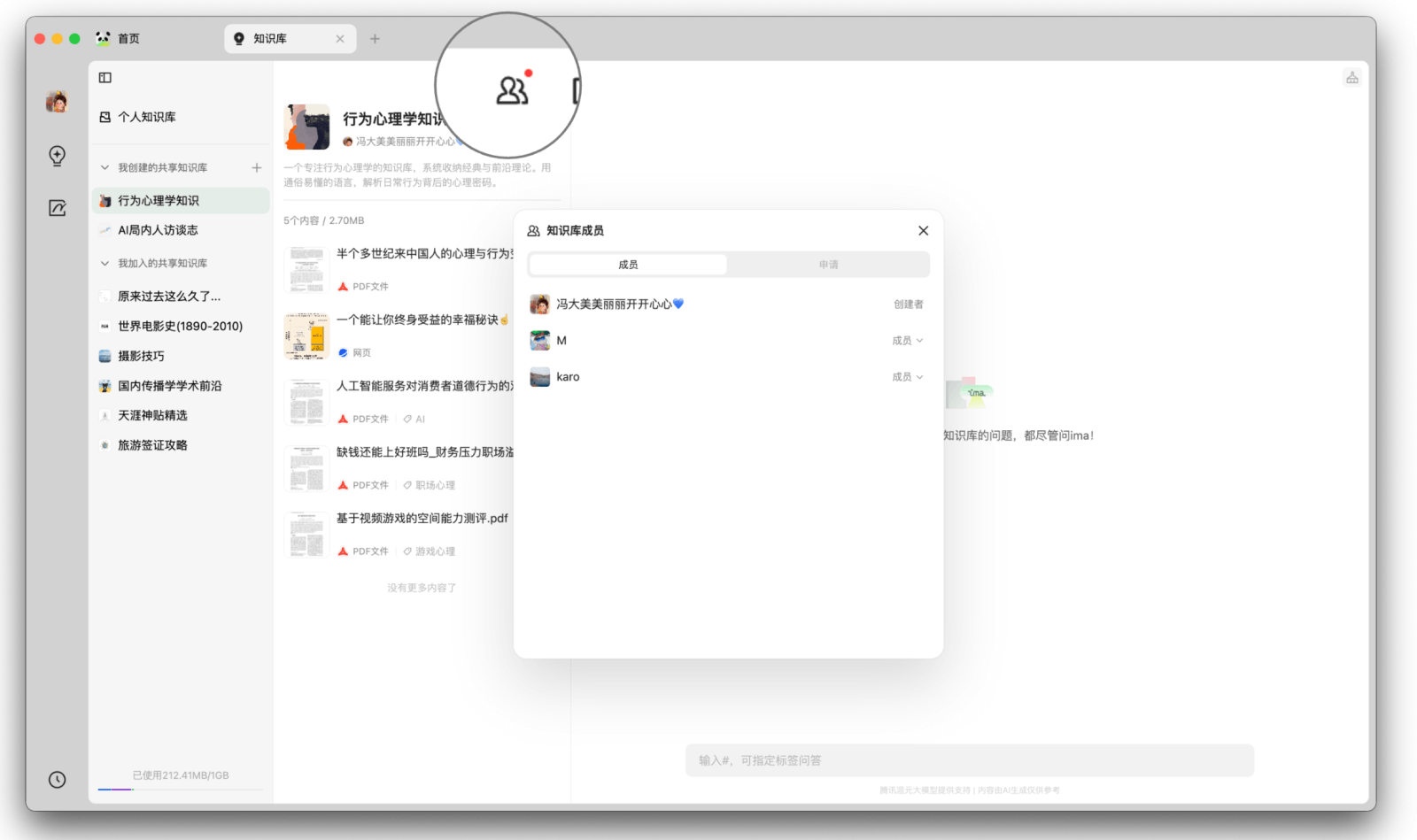 用户可以通过共享知识库的权限管理,来调整库中的资料是否可被其他成员获取: