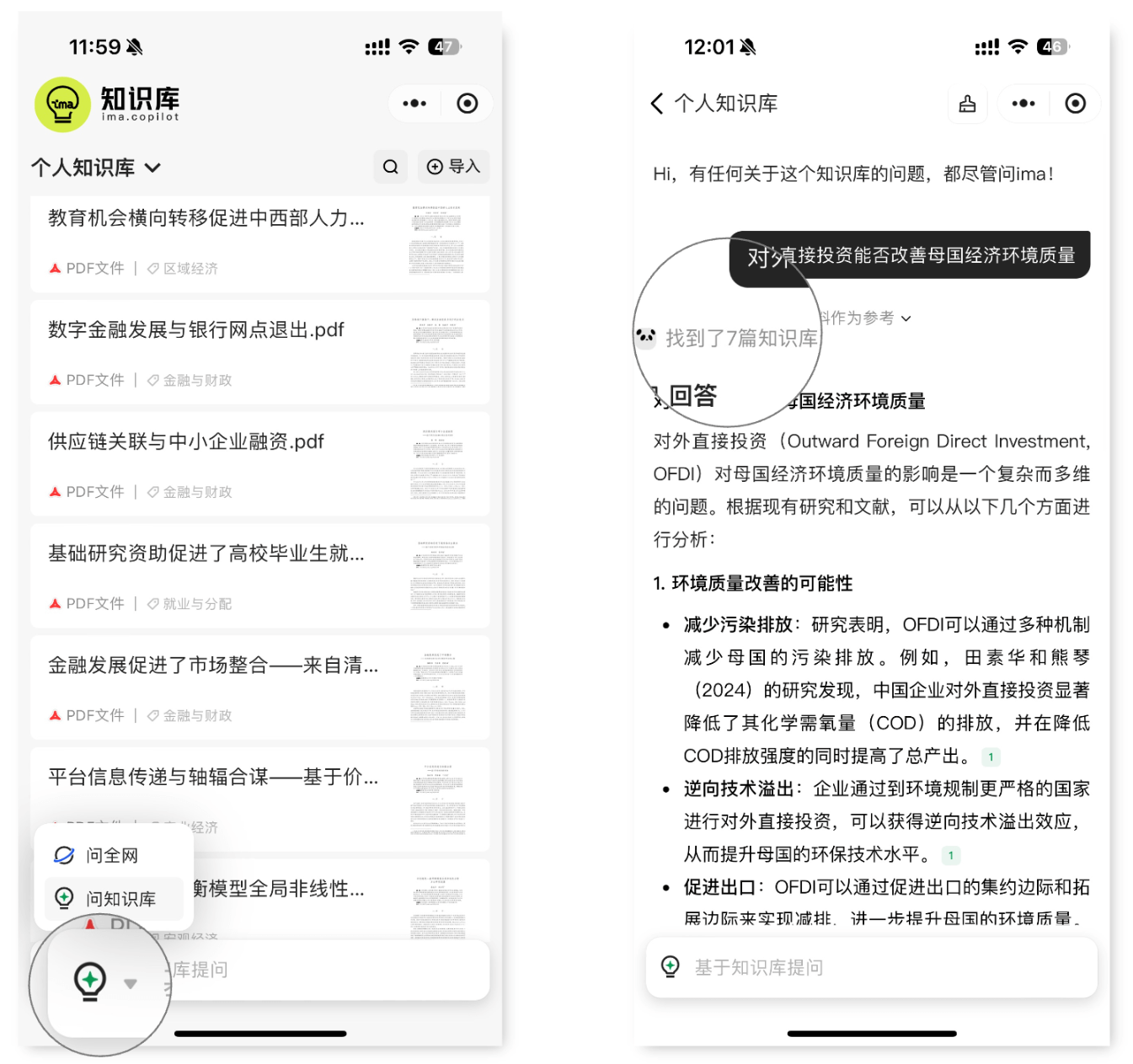 打开 ima 移动 APP,进入想要提问的知识库;在知识库页面底部的输入框内,输入问题并发送,即可开启基于当前知识库内容的问答。
