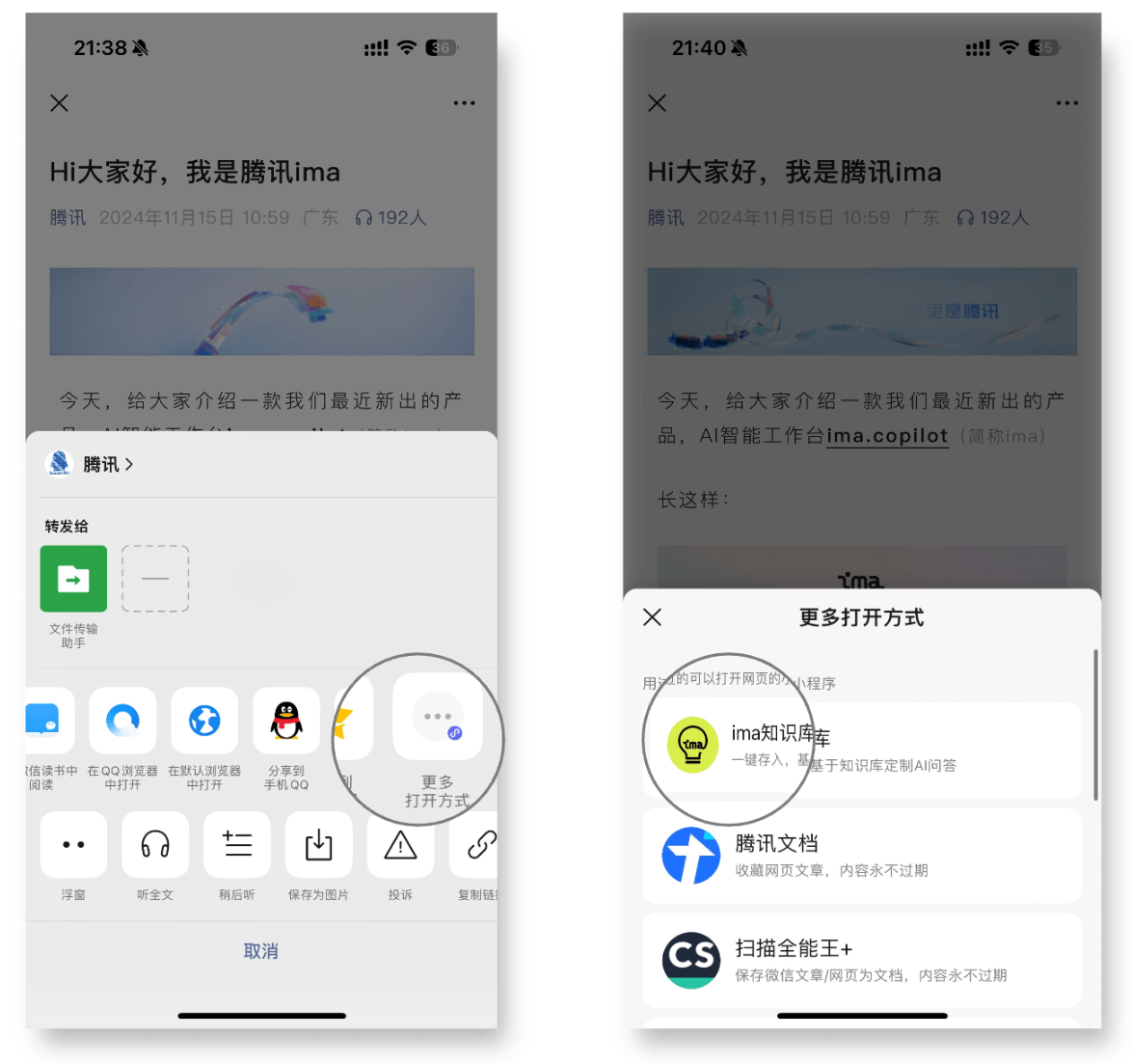 2)首次使用后,若在微信看到好内容,点击右上角“···”,点击“更多打开方式”,选择用“ima知识库”小程序打开,就可以把内容存入你的个人知识库。