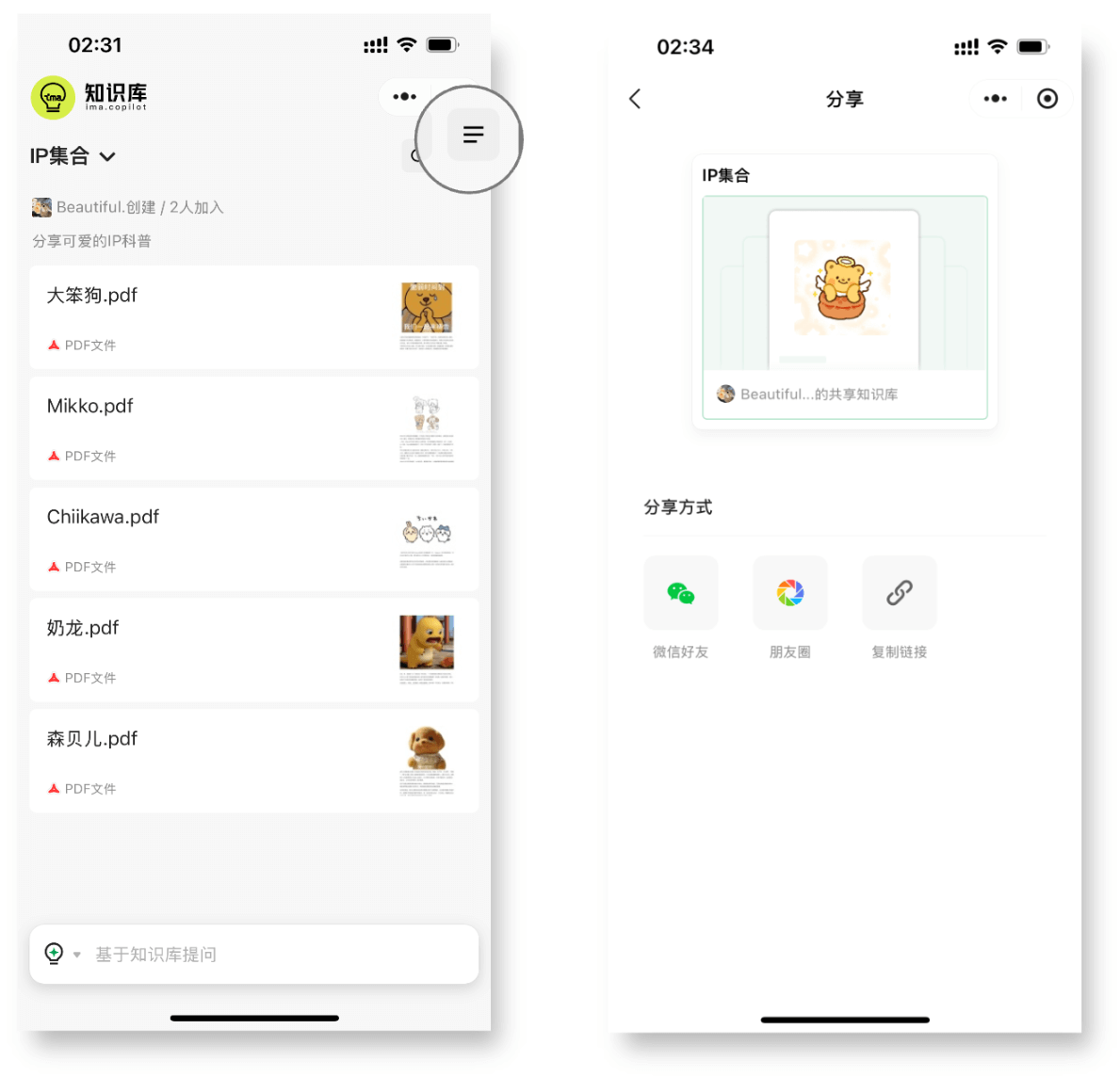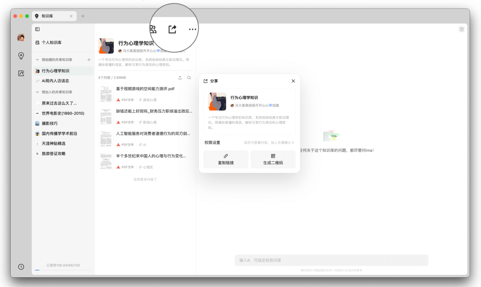 你也可以通过 ima 知识库小程序,直接把知识库分享到聊天或者朋友圈。