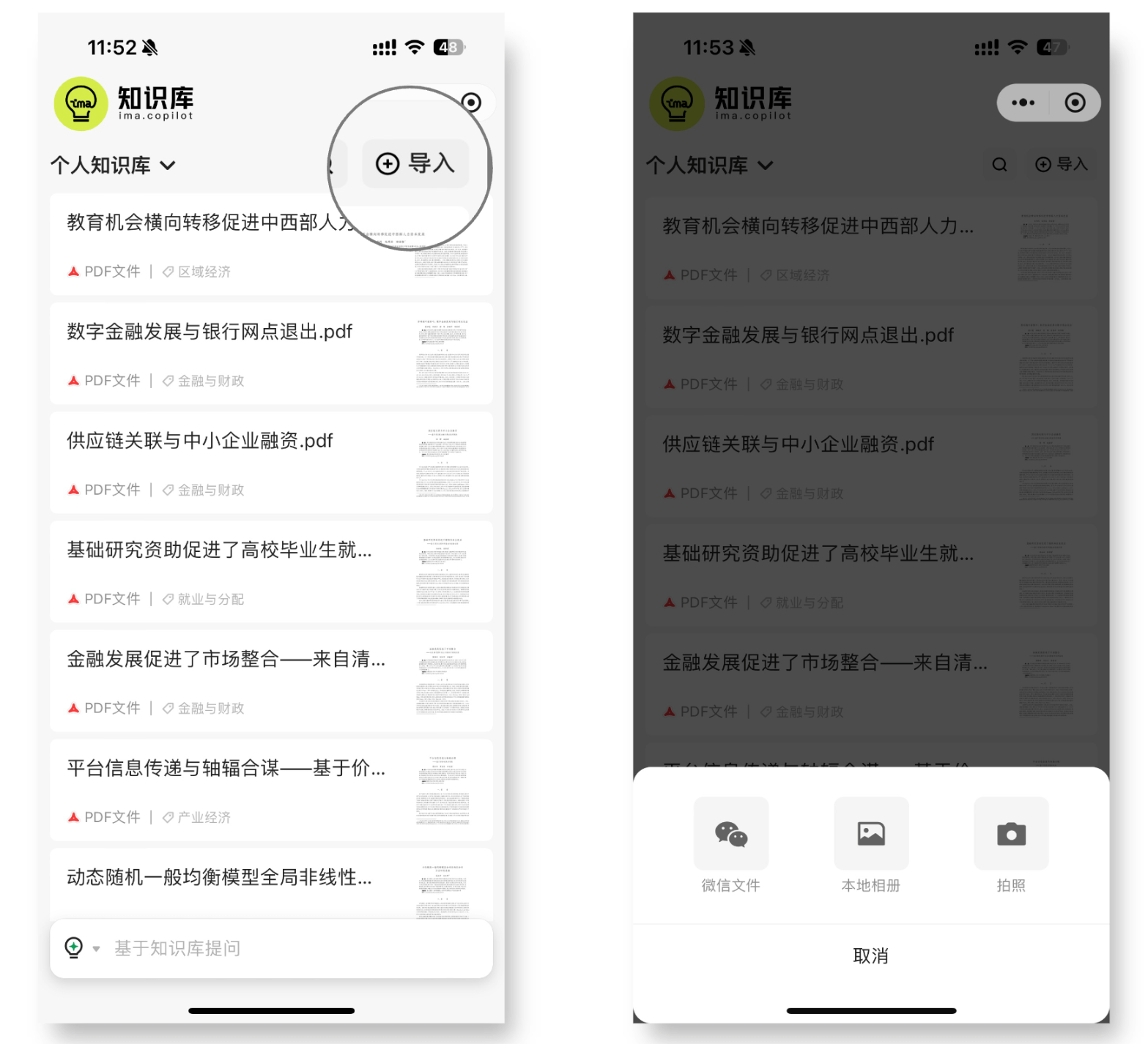 1)在微信搜索“ima 知识库”小程序;进入“ima 知识库”小程序后,点击右上角“导入”,即可选择微信文件/本地相册/拍照,完成对应内容的导入。