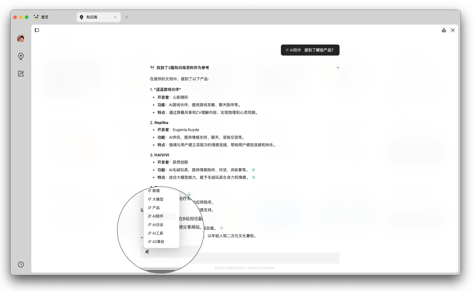 A:在 pc 端,对于有标签的知识库,进入知识库后在知识库页面底部输入框内输入符号“#”,即可唤起标签列表;在标签列表内选择一个或多个想要圈选提问的标签后,再输入具体想提出的问题,即可针对指定标签内容开启问答。