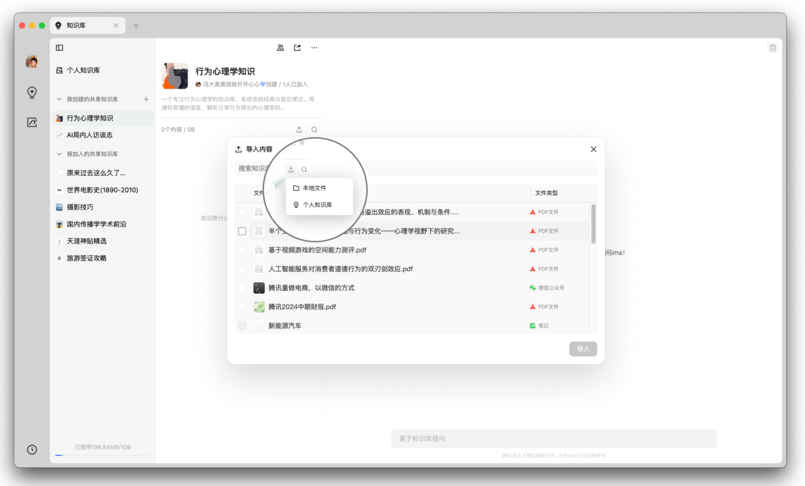 ② 从个人知识库、本地文件中导入内容,构建共享知识库